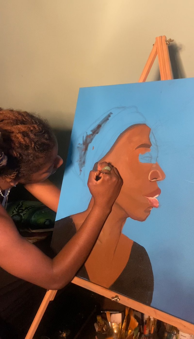 The calming blue background frames me in an atmosphere of hope and potential, emphasizing focus, clarity, and determination. This piece affirms that I am both the vision and an active member of the process. I empower myself to redefine my narratives and build a thriving, equitable future through energy transmutation. Self-empowerment is not just a dream, it’s happening now.