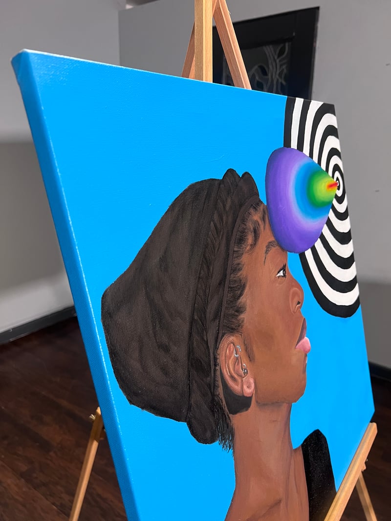 This self portrait is apart of a vision I have had for years. Imagination eats transformative energy. This is how I view myself, a being with infinite connection to energy, frequency & all that exists in every universe. Everything is interconnected. Third eye open wide and willing to receive and deliver thoughts, visions, creation and theory. Being able to receive is important because it allows me to understand & reiterate through creation. Downloads from the energy surrounding me as an artist is important because I use it as a way to guide me creatively and communicate to those who are visual learners opposed to those of us who have an inner knowing. This is the perfect representation of how I view myself.